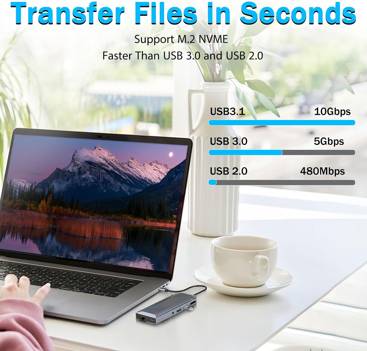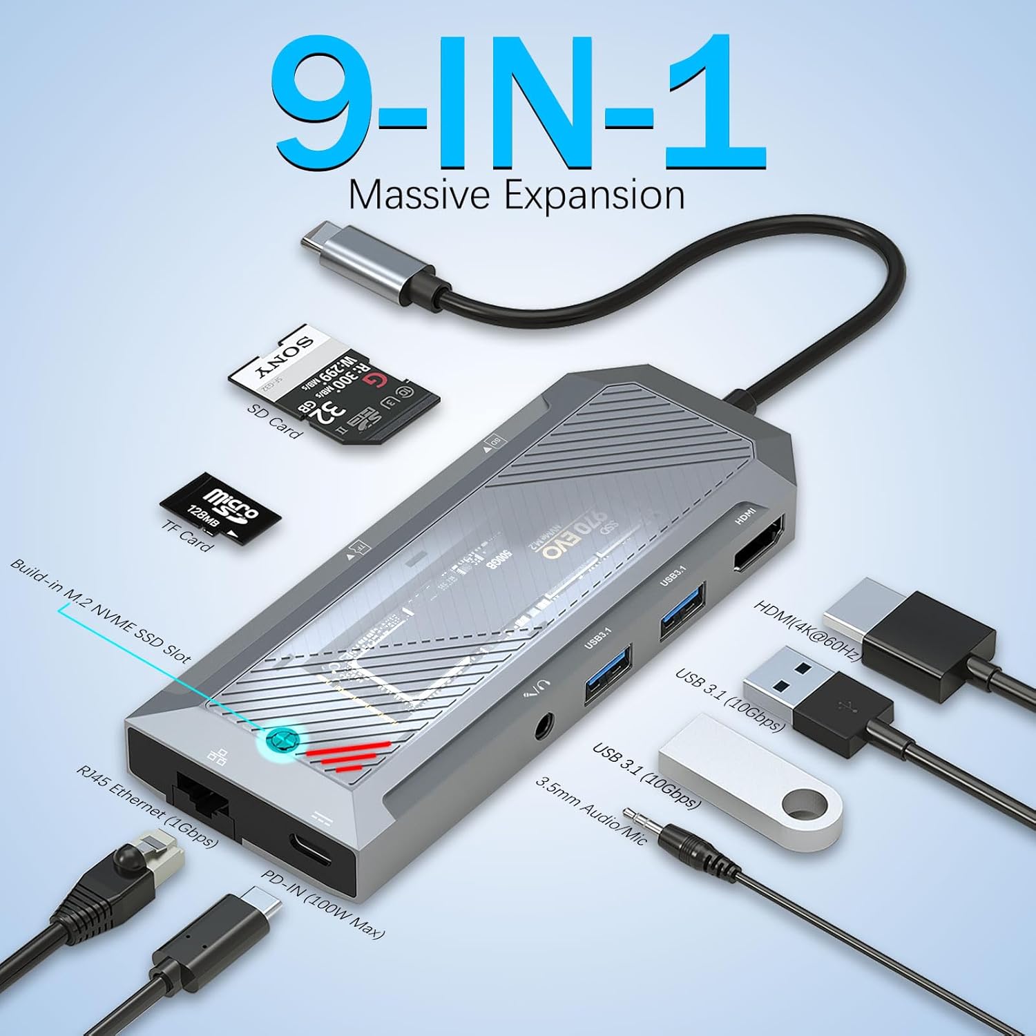 9-i-1 USB-C-hubb med SSD-hölje för M.2 NVMe 4K 60Hz HDMI-splitter – ultimata anslutningsmöjligheter och höghastighetslagringsexpansion