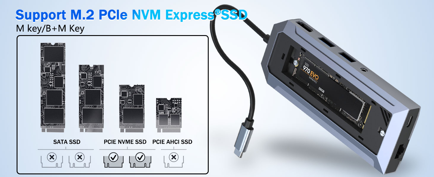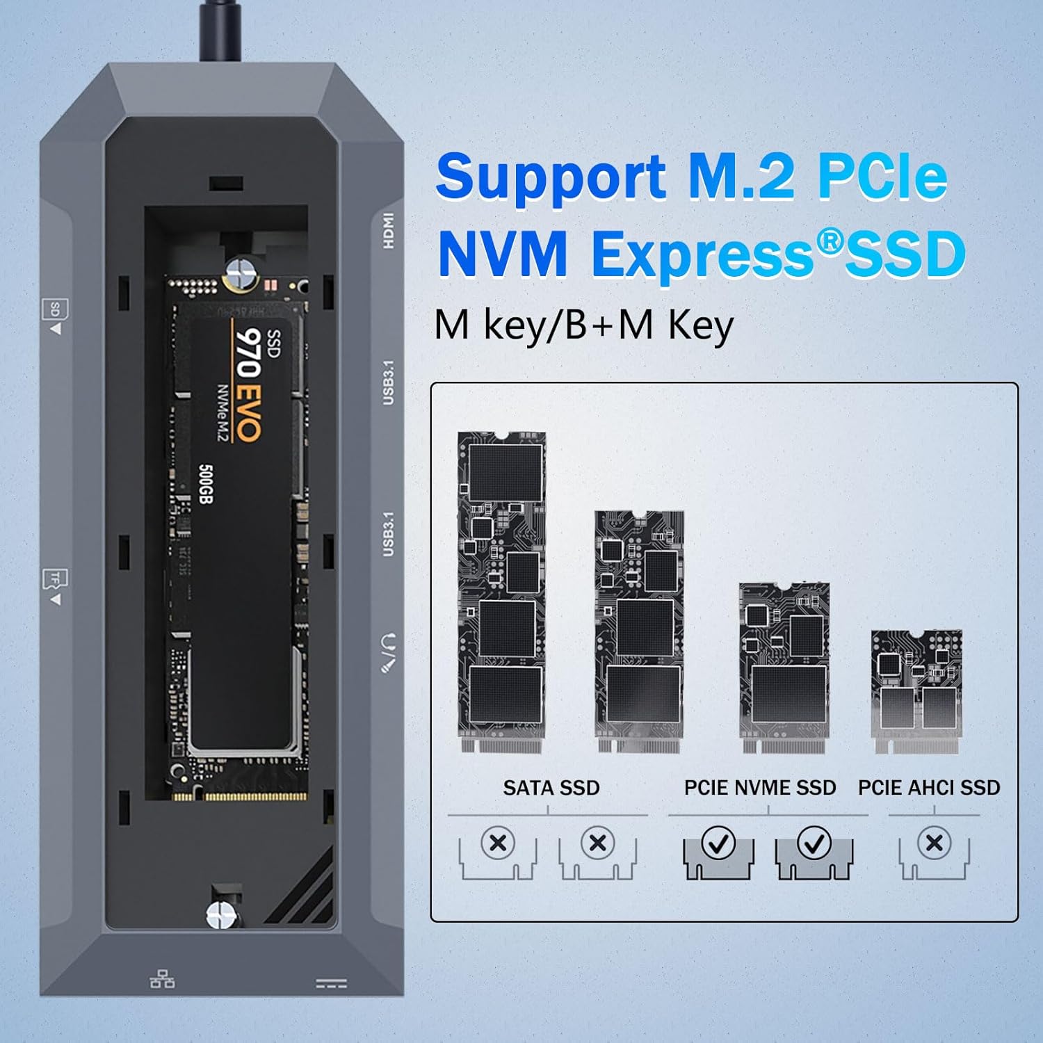Till skillnad från traditionella USB-hubbar har den här enheten ett dedikerat SSD-hölje som stöder M.2 NVMe solid-state-enheter. Denna funktion tillåter användare att lägga till höghastighetslagring direkt till sin arbetsyta utan att behöva en separat extern enhet.