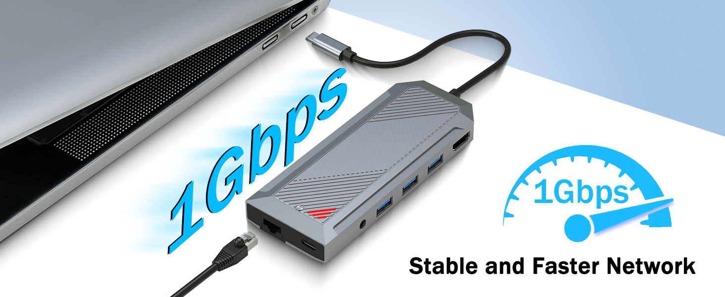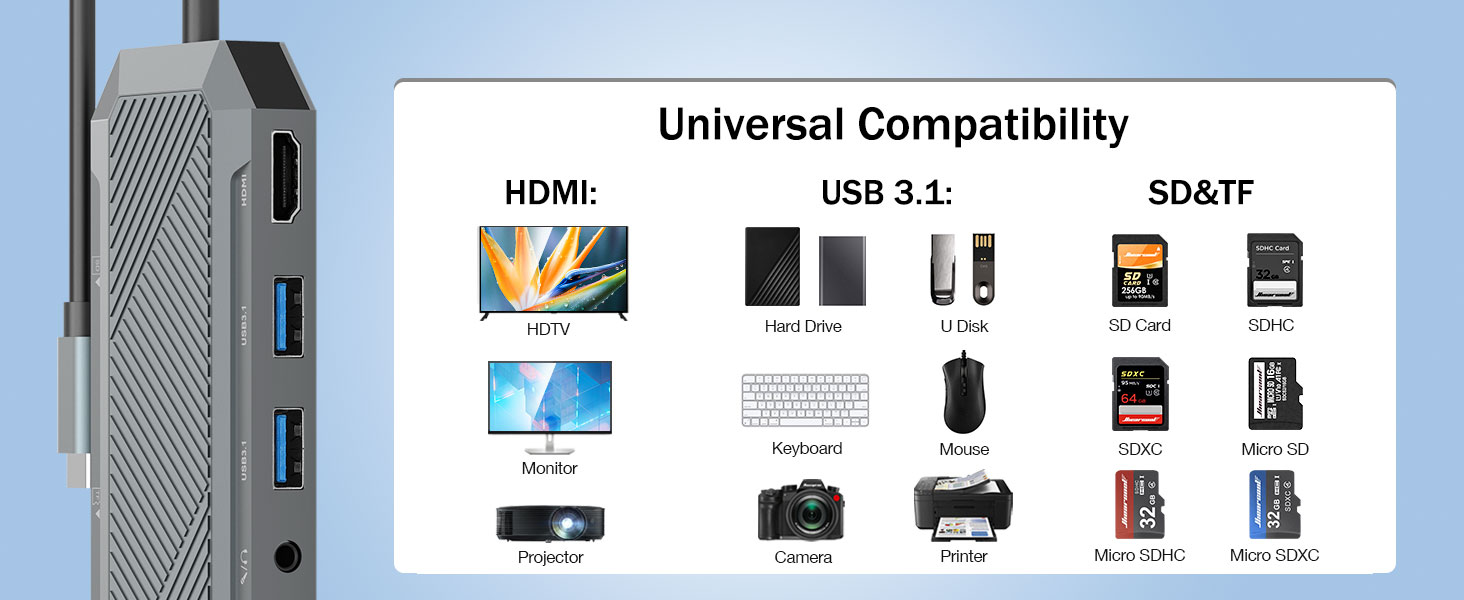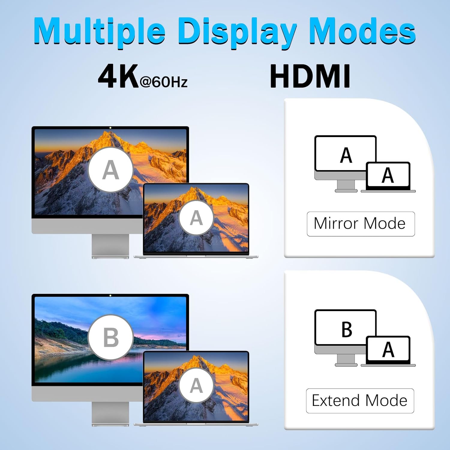 Hubben inkluderar också HDMI-videoutgång som kan leverera 4K-upplösning vid 60Hz, vilket ger jämna och ultratydliga bilder för presentationer, videoredigering eller underhållning.