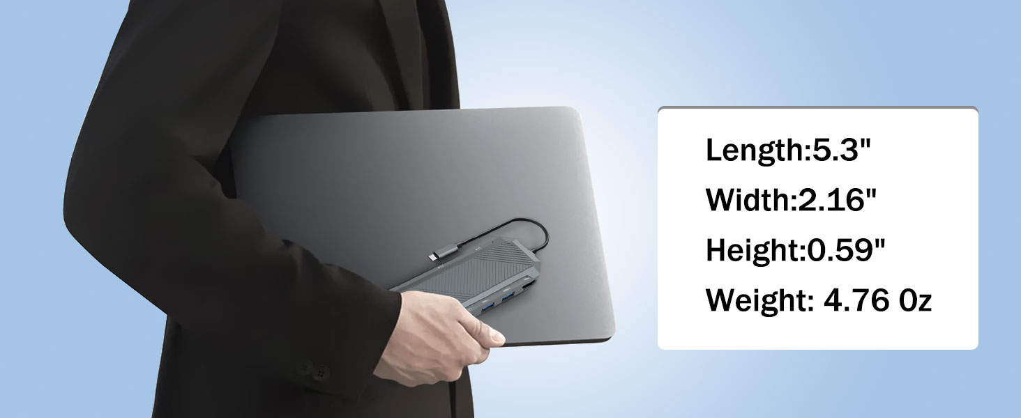 Trots sin kraftfulla funktionalitet är 9-i-1 USB-C Hub med SSD-hölje för M.2 NVMe 4K 60Hz HDMI Splitter designad för att förbli kompakt och lätt. Detta gör den lätt att bära i laptopväskor, ryggsäckar eller reseväskor.