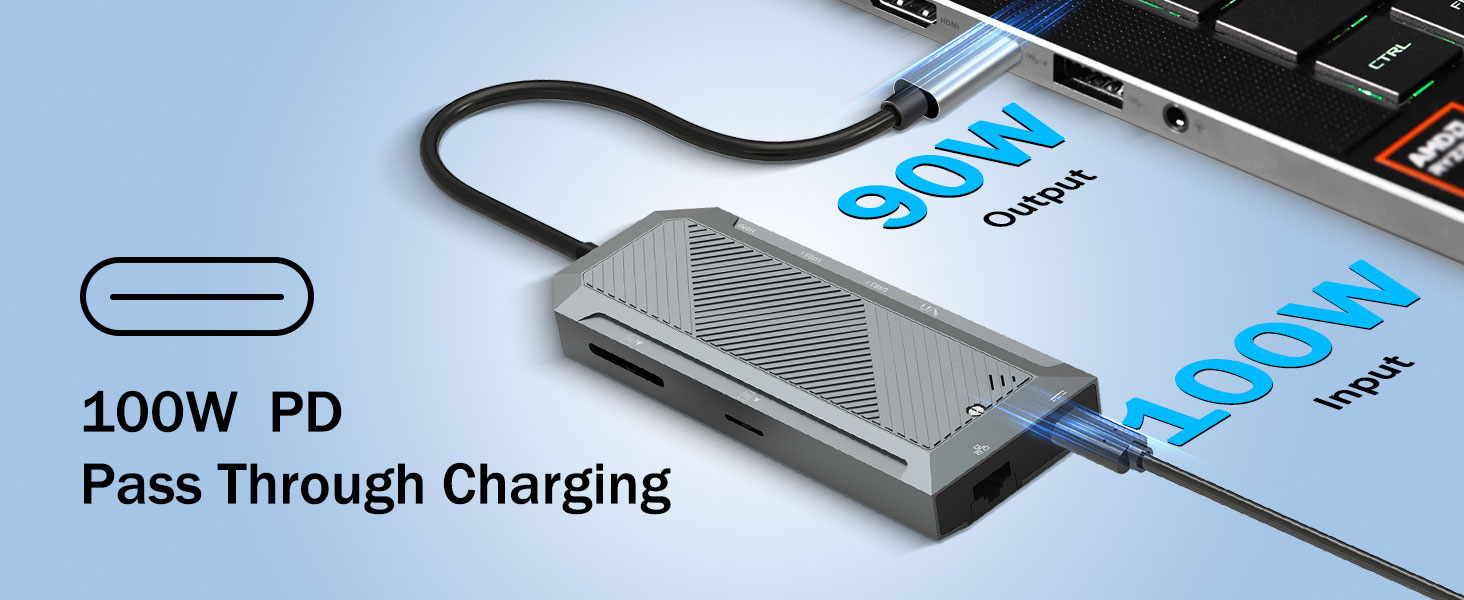 Stöd för strömleverans säkerställer att enheter förblir laddade medan hubben används. USB-C PD-porten låter ström passera genom hubben och in i den anslutna bärbara datorn eller surfplattan.