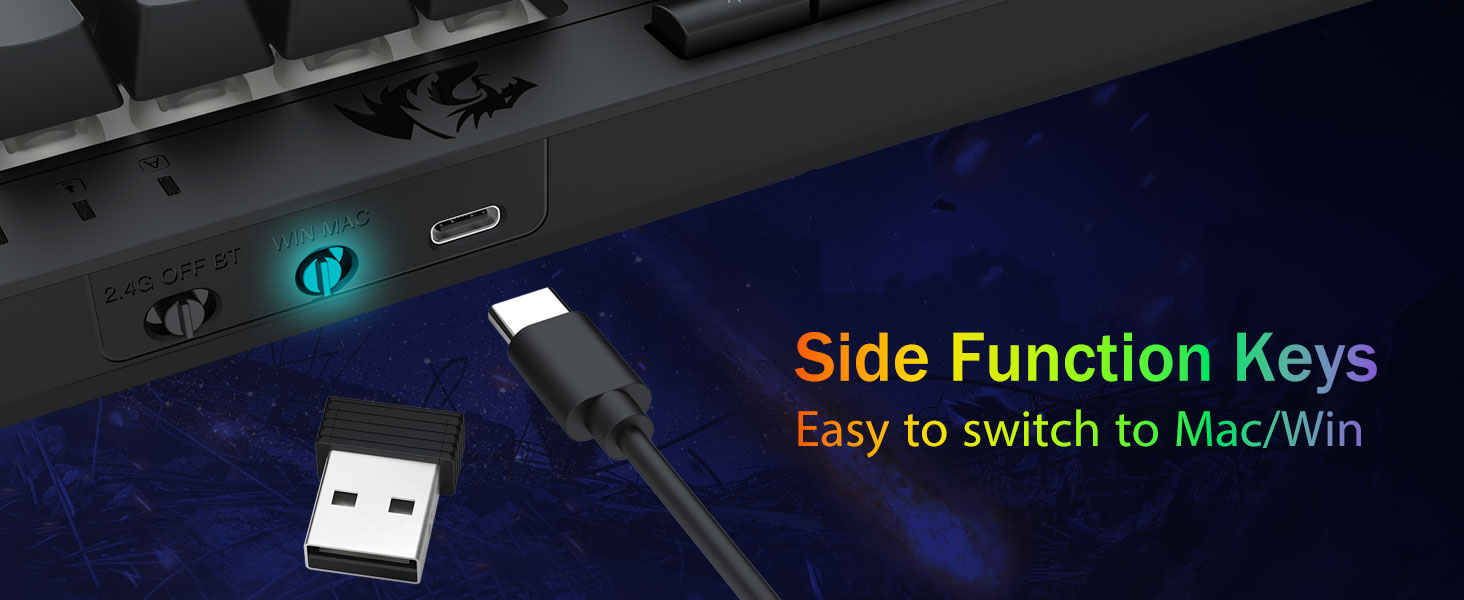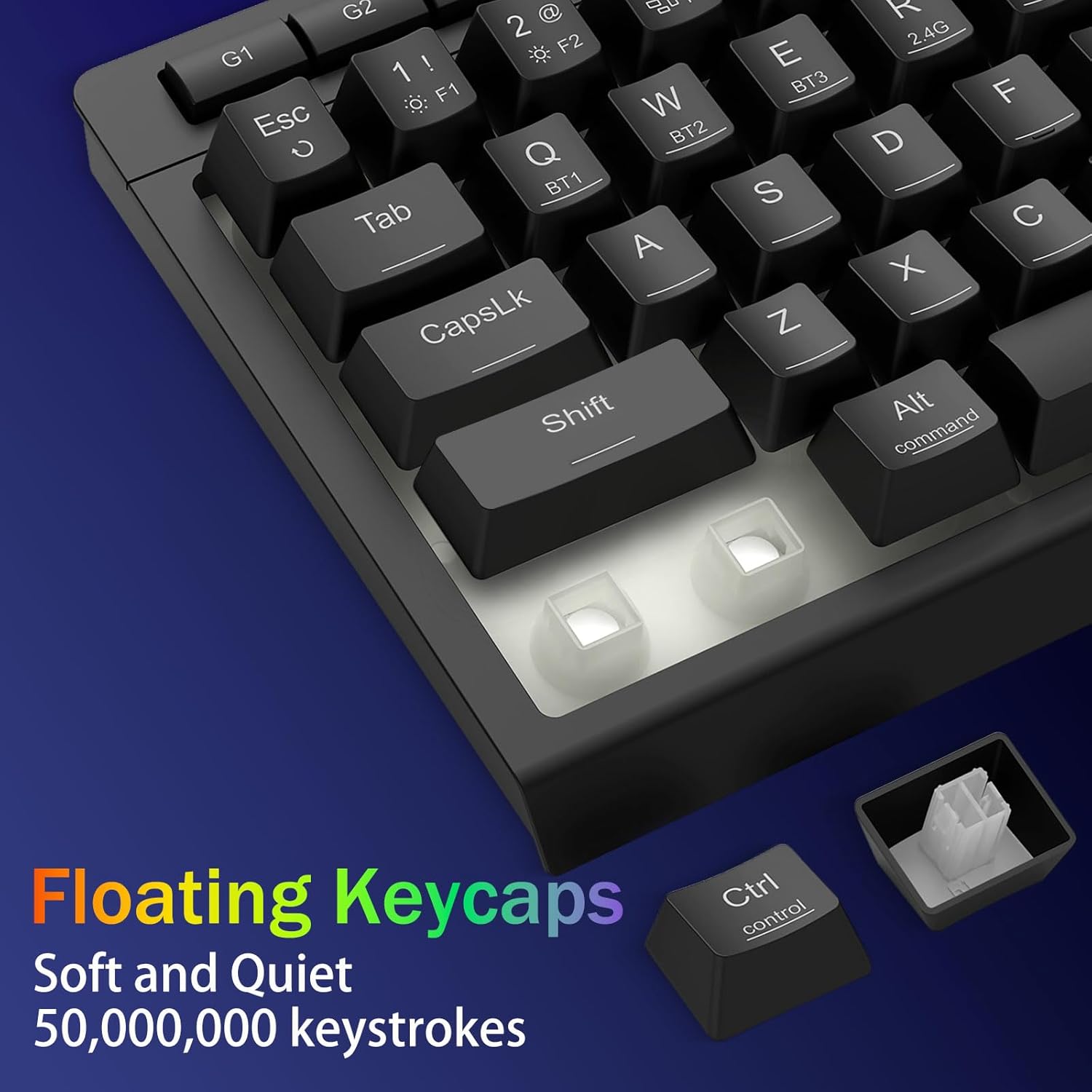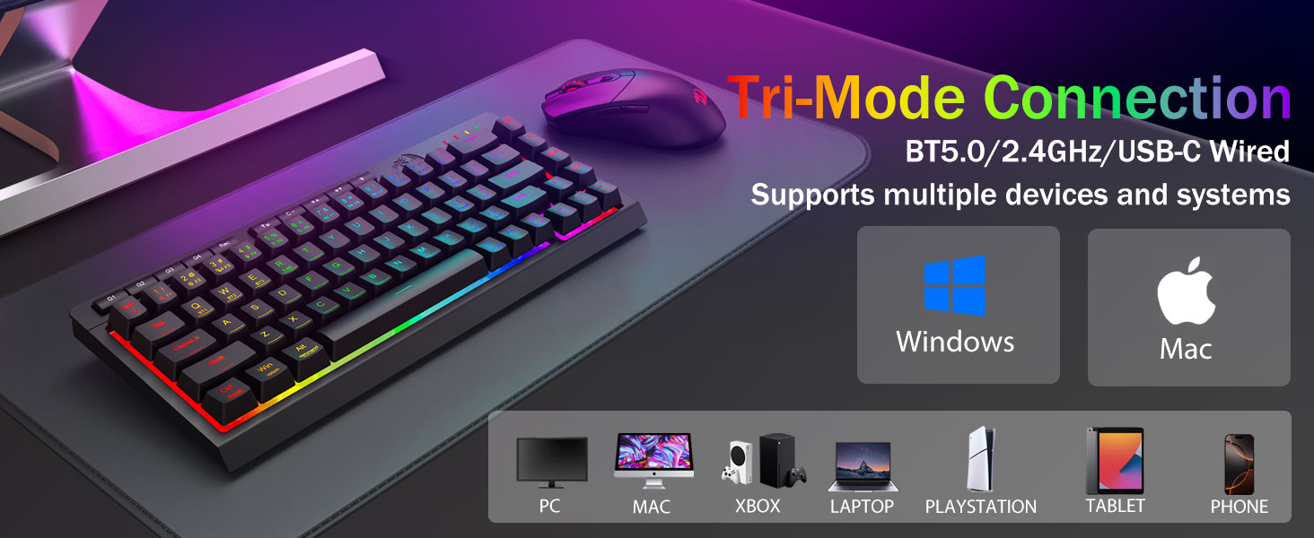 Mångsidighet i tre lägen och behärskning av flera enheter -Växla sömlöst mellan Bluetooth 5.0, 2.4GHz trådlöst eller USB-C trådbundna lägen, anslut upp till 5 enheter samtidigt (PC, Mac, surfplattor, telefoner, PS/XBOX). Växla enkelt enheter via genvägsknappar eller sidoknapp – perfekt för hybridarbete/spelinställningar. Håll dig strömförsörjd i veckor med batteriet på 4 000 mAh (30+ dagars standby, 50 timmars RGB-körtid).