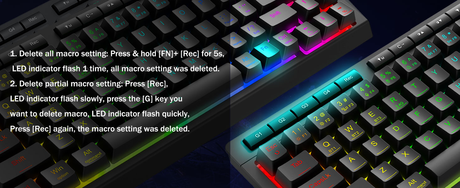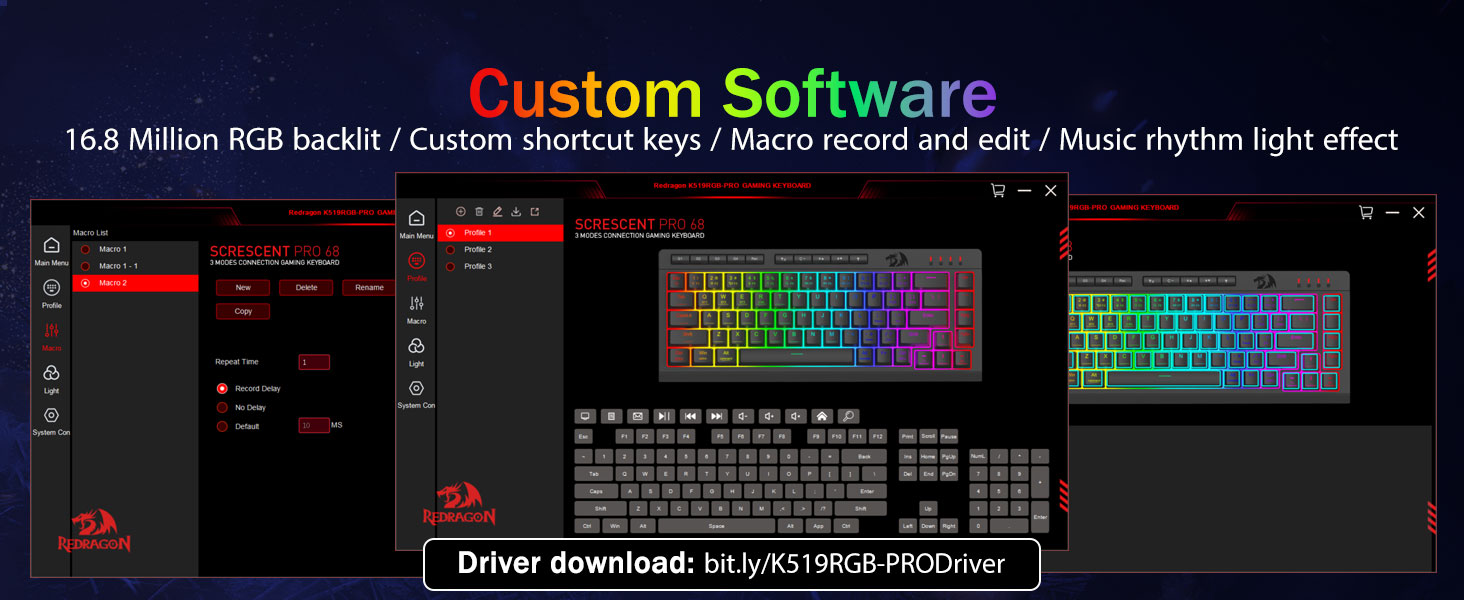 Anpassningsbara makron, enkel kontroll -Programmera de fyra inbyggda makrotangenterna (G1-G4) direkt – ingen programvara krävs. Spela in komplexa kombinationer för spel, genvägar för produktivitet eller mediekommandon. Omdefiniera ditt arbetsflöde på några sekunder. Du kan också använda programvara för att anpassa funktioner, skapa makron, justera RGB-ljus och ställa in genvägar. Programlänk: bit.ly/K524RGB-PRODriver