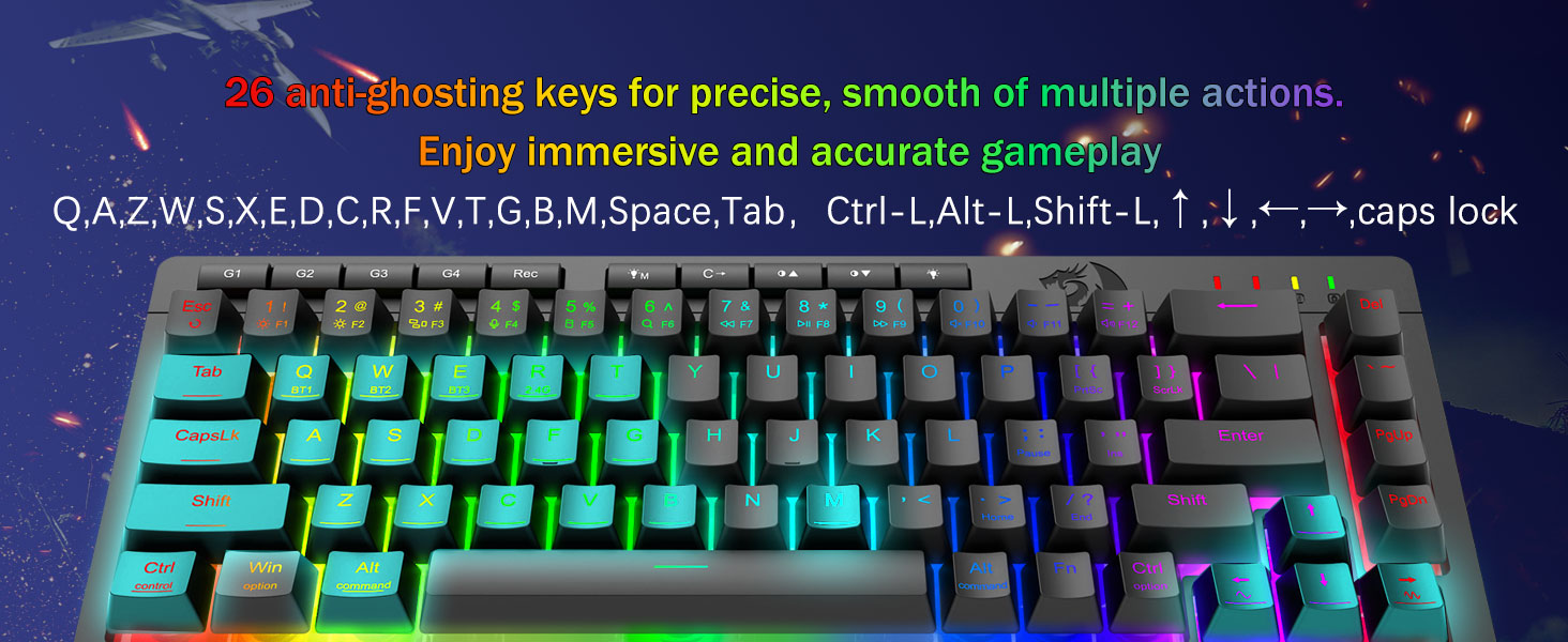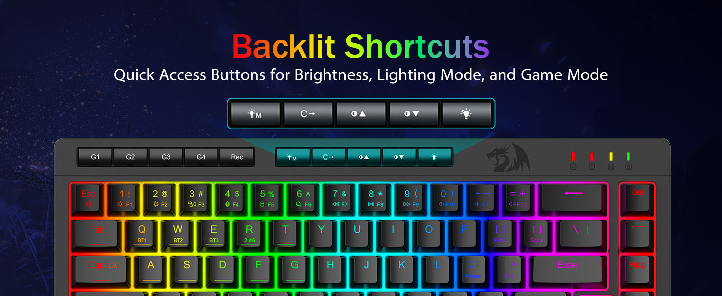Pro-Grade spelprestanda och dedikerade bakgrundsbelysta kontroller -Med anti-ghosting-tangenter (nycklar med ett understreck) som gör att 26 tangenter kan arbeta samtidigt för snabba och exakta spelsvar som du tänkt dig. Snabbåtkomstknappar för ljusstyrka, ljusläge och spelläge för att snabbt justera ljusstyrka, belysningsprofiler och aktivera spelläge med en knapptryckning.