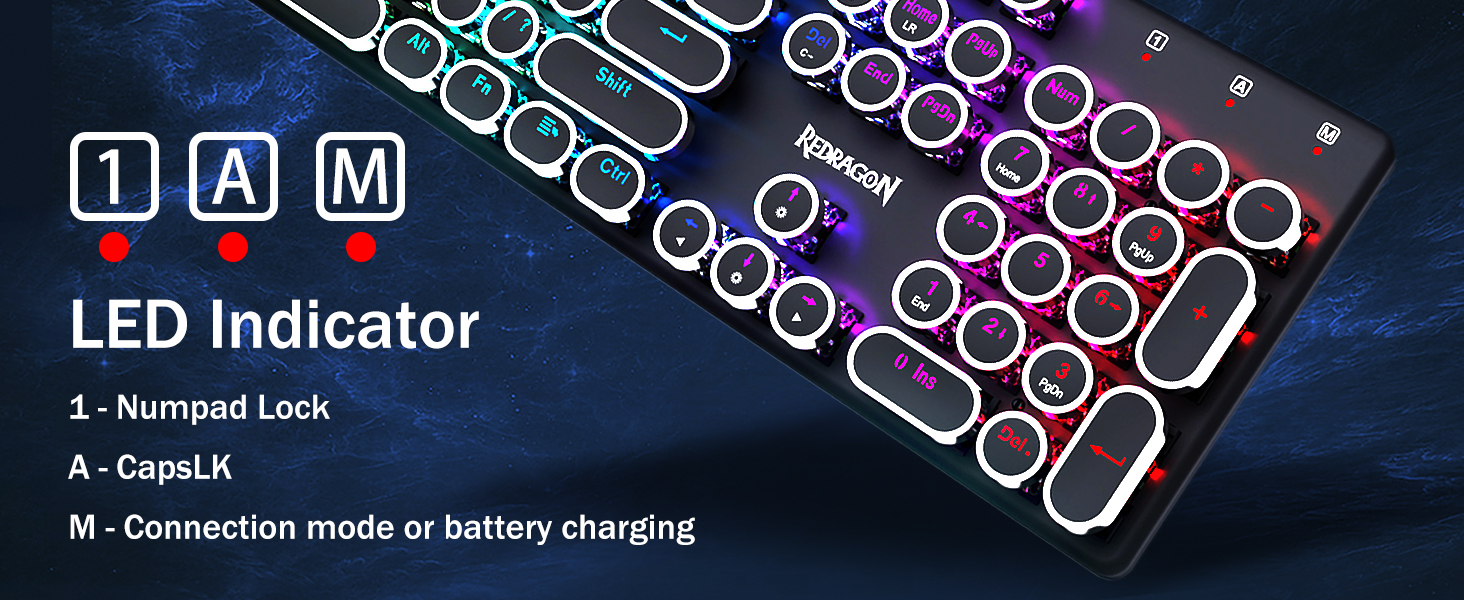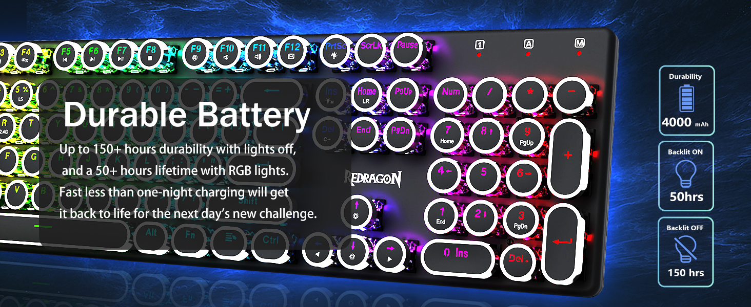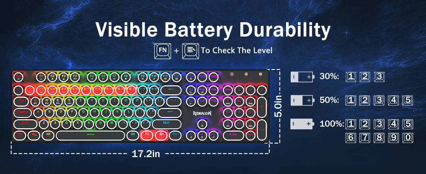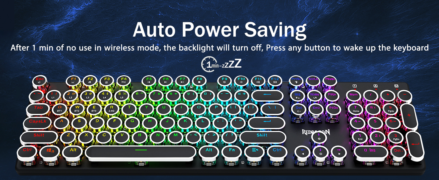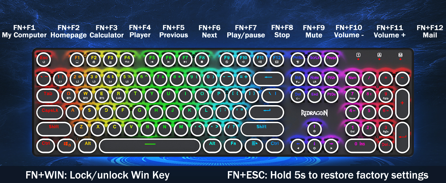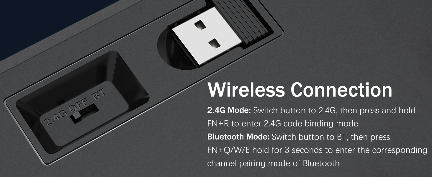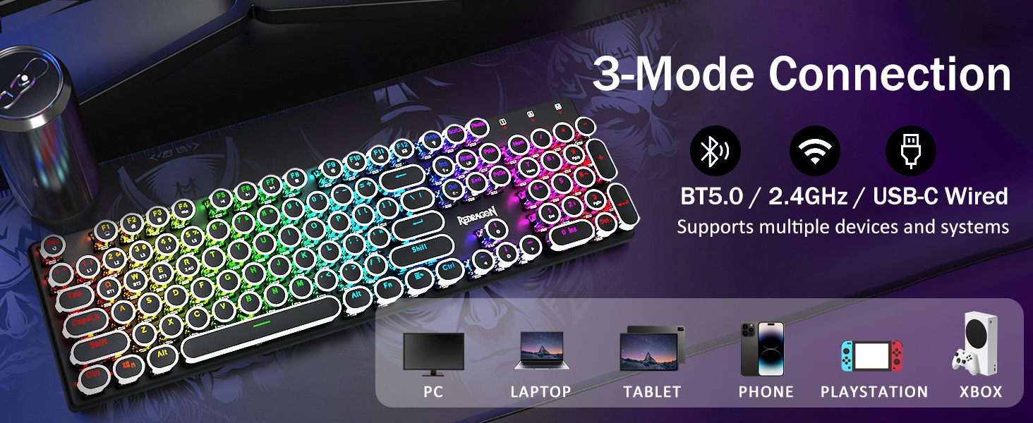 𝟯-𝗠𝗼𝗱𝗲 𝗖𝗼𝗻𝗻𝗲𝗰𝘁𝗶𝗼𝗻 -Utrustad med Redragons innovativa tri-mode anslutningsteknik, USB-C trådbunden, Bluetooth 5.0/3.0 & 2.4Ghz trådlösa lägen som gör användarupplevelsen uppgraderad till en annan nivå inom alla områden. Tryck FN+Q/W/E till Bluetooth-läge, tryck FN+R till 2.4G-läge.
