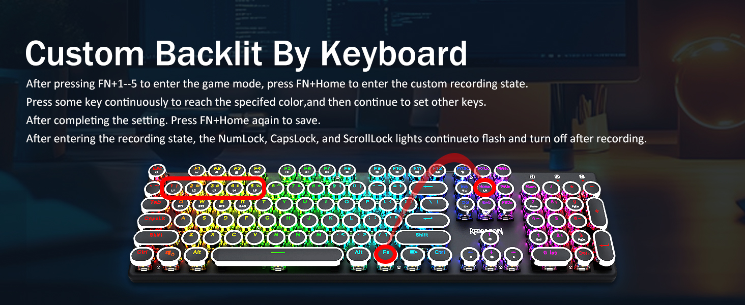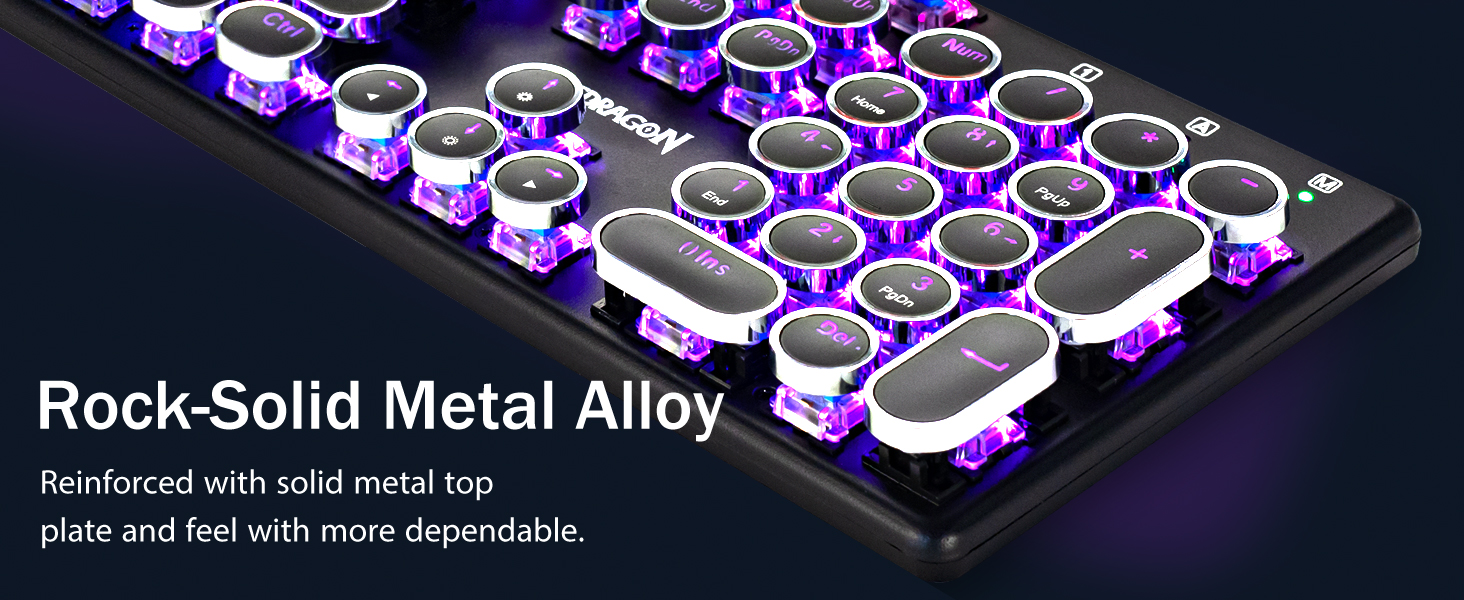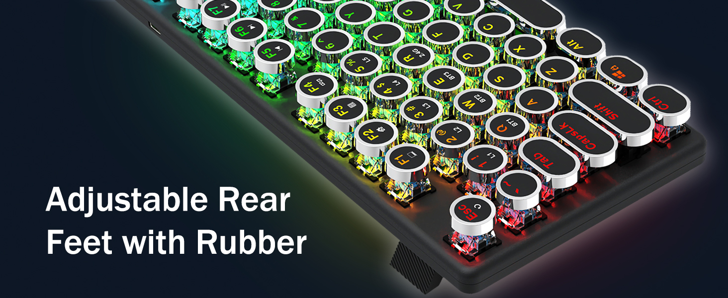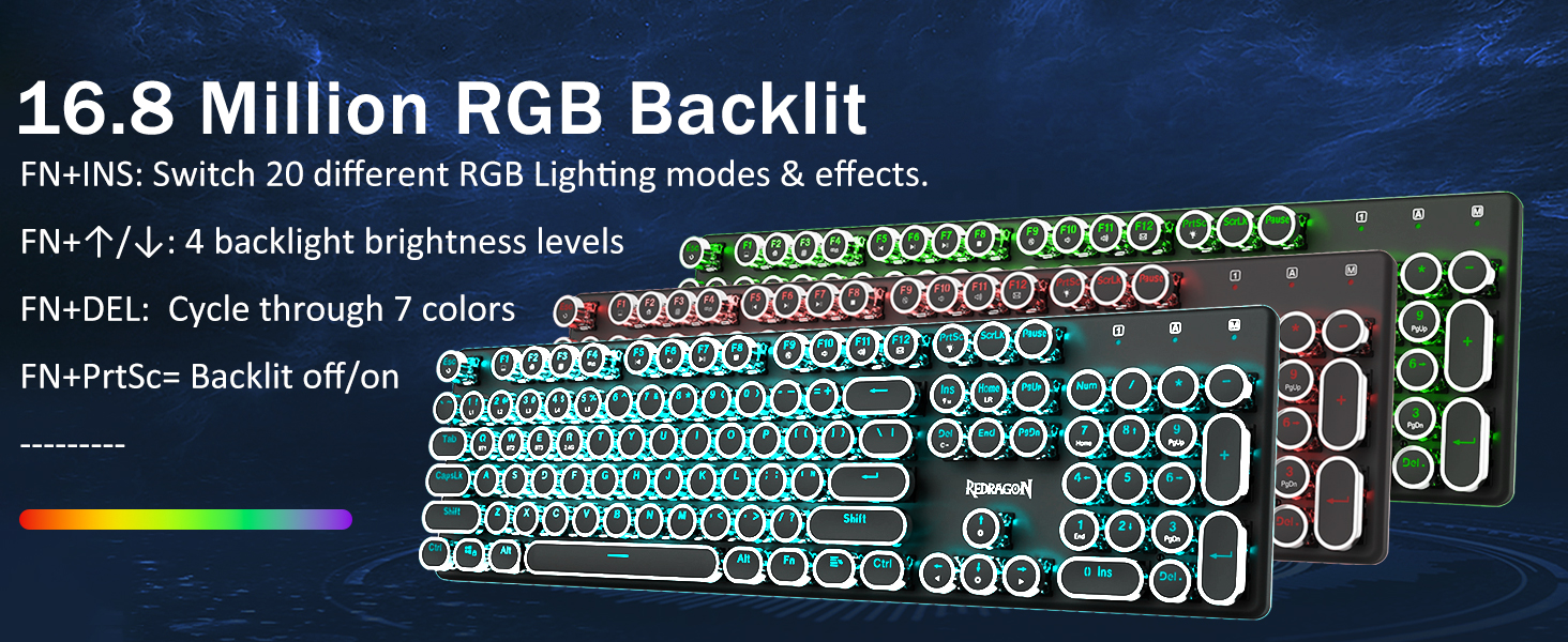 𝗥𝗲𝘁𝗿𝗼 𝗧𝘆𝗽𝗲𝘄𝗿𝗶𝘁𝗲𝗿 𝗦𝘁𝘆𝗹𝗲 𝘄𝗶𝘁 𝗠𝗲𝗰𝗵𝗮𝗻𝗶𝗰𝗮𝗹 𝗞𝗲𝘆𝘀 -Upp till 20 förinställda bakgrundsbelysningslägen är fria att välja av själva tangentbordet eller av programvara. 4 Ljusstyrka och flödeshastighet är också justerbar ombord. Välj dina egna föredragna lägen för alla spel. 7 olika solida färger ingår: röd, grön, blå, gul, lila, cyan, vit. Varje nyckel kan anpassas till olika färger du vill ha.