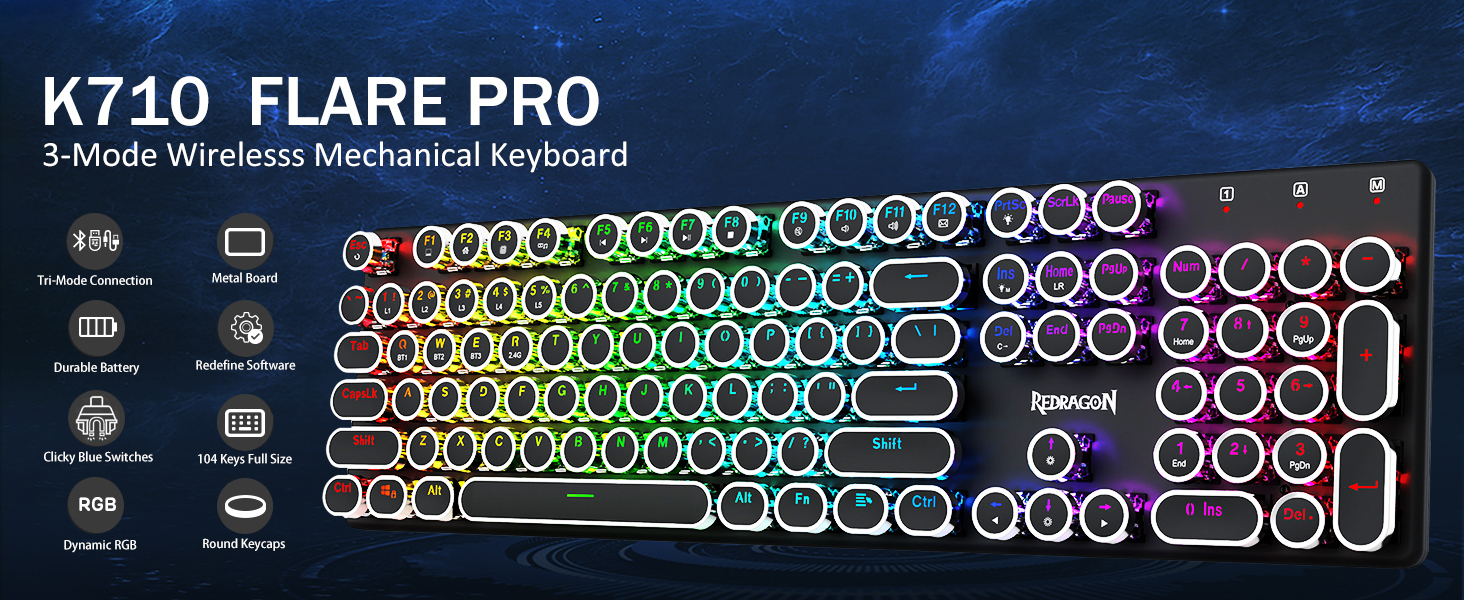 𝗗𝗲𝗽𝗲𝗻𝗱𝗮𝗯𝗹𝗲 𝗠𝗲𝘁𝗮𝗹 𝗣𝗮𝗻𝗲𝗹 & 𝟭𝗟𝗰 𝗔𝗻𝘁𝗶 𝗚𝗵𝗼𝘀𝘁𝗶𝗻𝗴 -Uppgraderad FLARE PRO-version fortsätter att använda samma tankfasta metallmaterial. Håll tangentbordet stadigt och elegant på skrivbordet för en förstklassig skrivupplevelse. K710-tangentbordet stöder 104-tangenters anti-ghosting-teknik, gör att flera tangenter kan tryckas ner samtidigt utan konflikt.