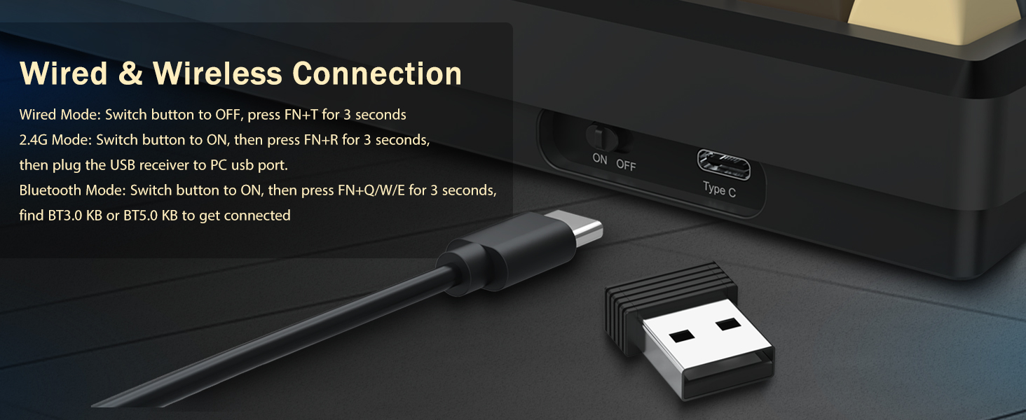 Tangentbordet stöder trådlös anslutning för bekvämlighet och en trådbunden USB-anslutning för stabil prestanda. Användare kan växla mellan lägen beroende på deras inställningar.