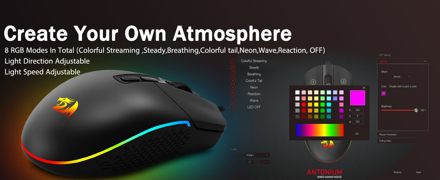 8 anständiga RGB-bakgrundsbelysta lägen- Slå på bakgrundsbelysningen och gör några dödsfall på ditt spelslagfält. Den hypade dynamiska RGB-bakgrundsbelysta atmosfären kommer aldrig att svika dig när du dekorerar ditt spelutrymme, det skulle vara bättre med andra Redragon-tillbehör med lampor på.