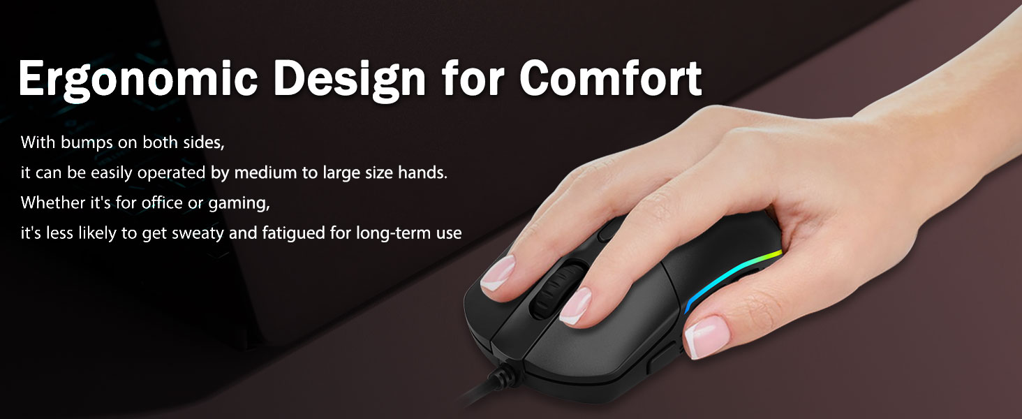 Komfortgrepp- De ergonomiska knölarna på båda sidor gör att spelmöss passar i alla händer. Det ger långvarig komfort för spelare, utan trötthet även under långa timmar av intensivt spelande. Den glider inte när du lyfter spelmusen eller gör snabba och exakta svep.