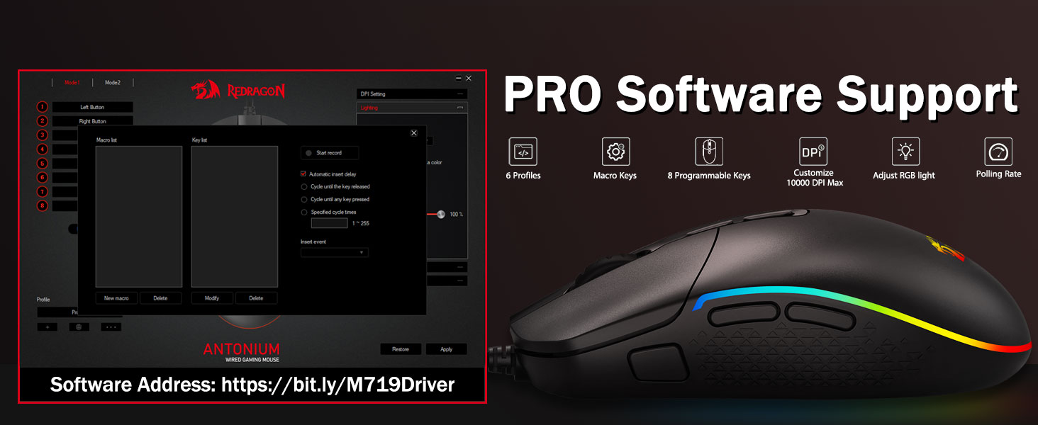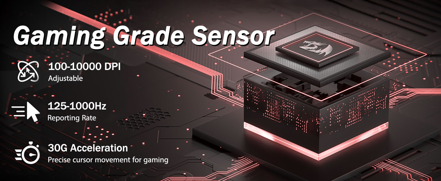 5 justerbara DPI-nivåer och 4 pollingfrekvens- M719-musen är designad med 5 tillgängliga DPI-nivåer: DPI 400/800/1600/2400/4000. lätt att växla mellan olika spelbehov. DPI kan justeras fritt med ±100 från 100 till 10000 via mjukvara för att möta alla dina behov. 4 pollingfrekvens är justerbar: 125Hz/250Hz/500Hz/1000Hz, hög pollingfrekvens säkerställer en mjuk och snabb rörelse.