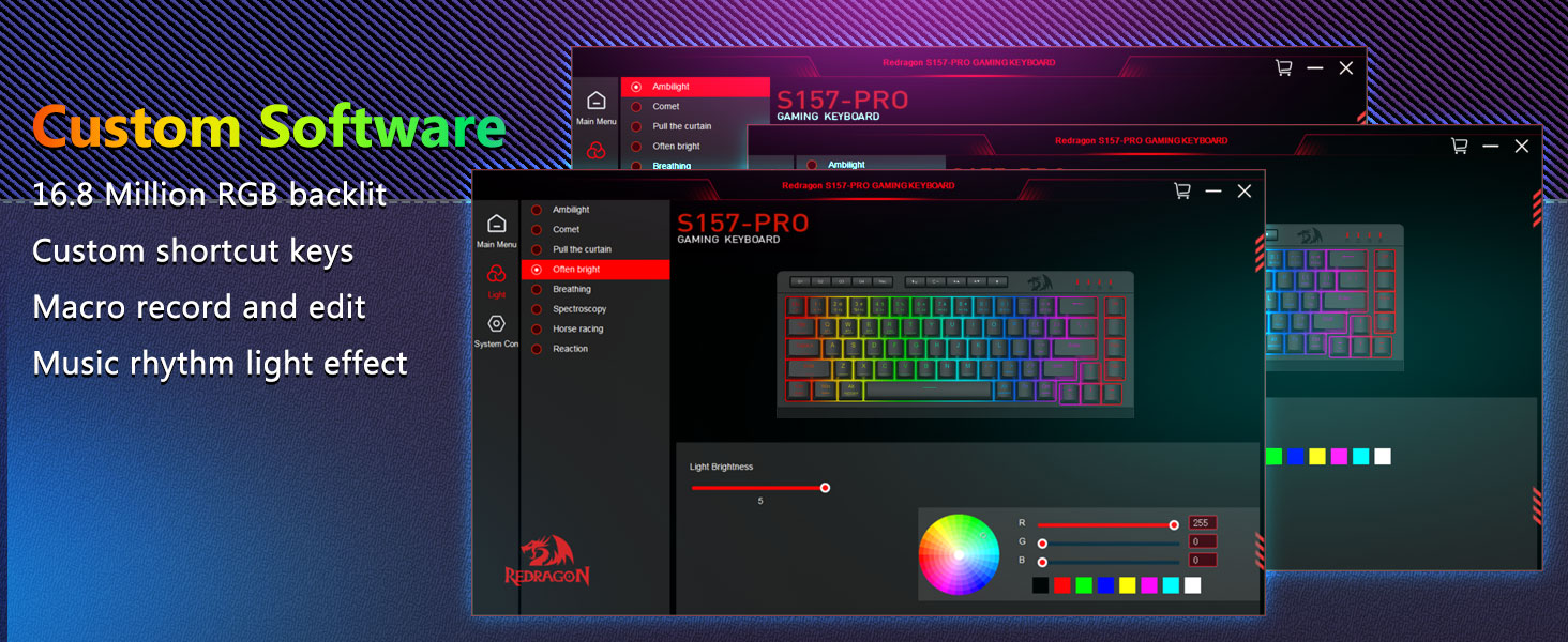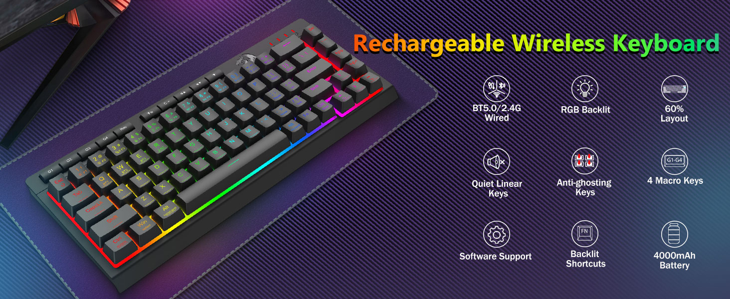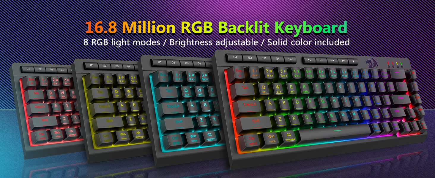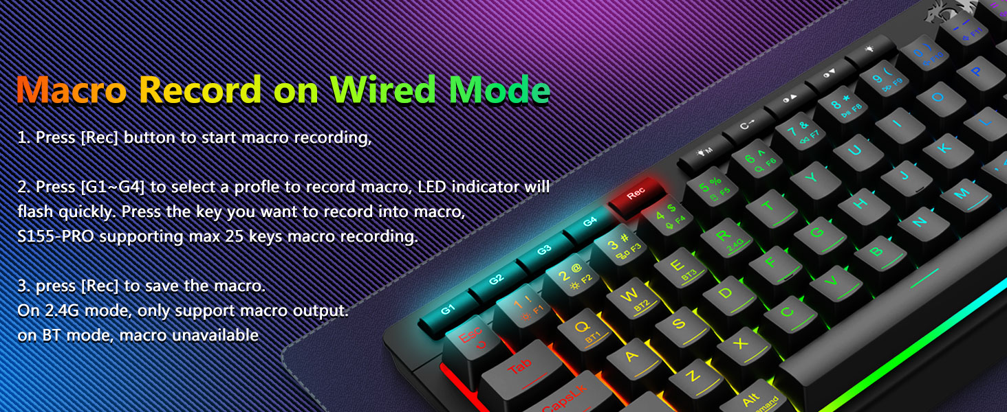 Anpassningsbara makron, dedikerade bakgrundsbelysta kontroller- Programmera de fyra inbyggda makrotangenterna (G1-G4) omedelbart – ingen programvara krävs. Spela in komplexa kombinationer för spel, genvägar för produktivitet eller mediekommandon. Omdefiniera ditt arbetsflöde på några sekunder. Du kan också använda programvara för att anpassa funktioner, skapa makron, justera RGB-ljus och ställa in genvägar. Med anti-ghosting-tangenter (nycklar med ett understreck) som gör att 26 tangenter kan arbeta samtidigt för snabba och exakta spelsvar som du tänkt dig. Snabbåtkomstknappar för ljusstyrka, ljusläge och spelläge för att snabbt justera ljusstyrka, belysningsprofiler och aktivera spelläge med en knapptryckning.