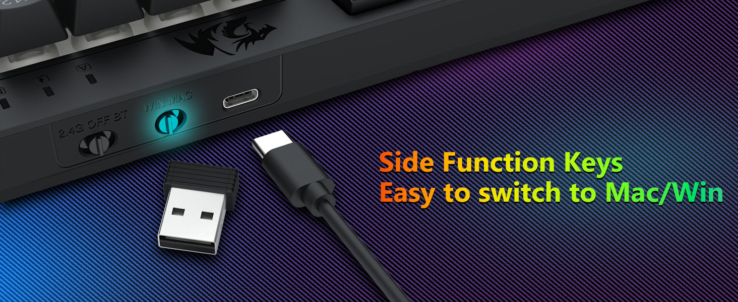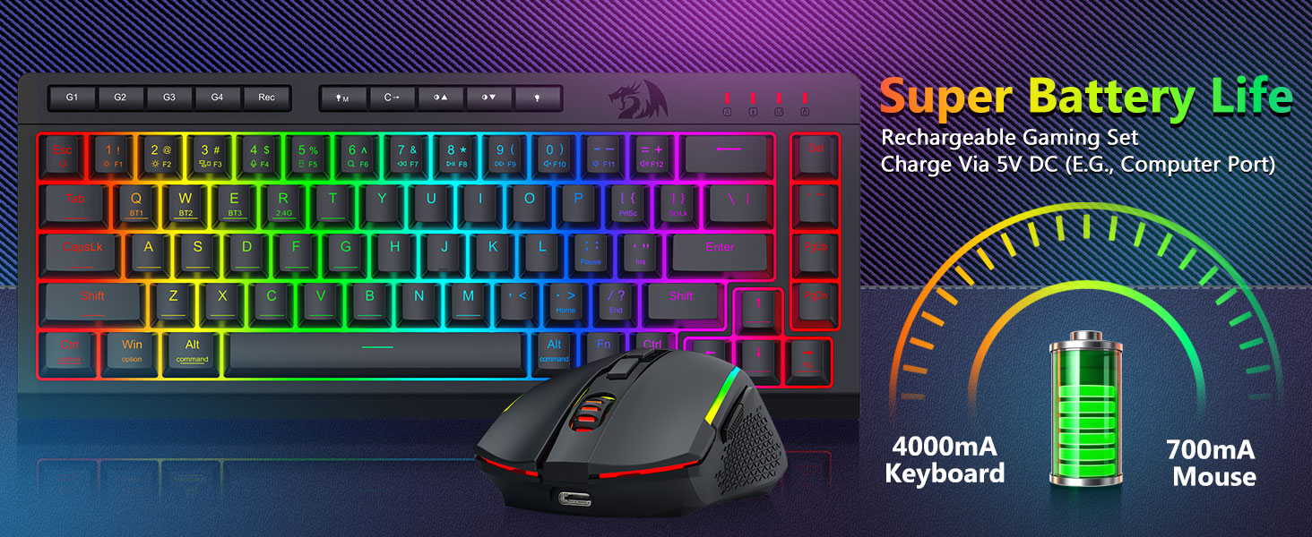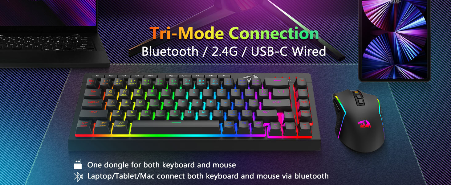 Tri-Mode Mångsidighet Tangentbord och mus- Växla sömlöst mellan Bluetooth 5.0, 2.4GHz trådlöst, eller USB-C trådbundna lägen, anslut till olika enheter (PC, Mac, surfplattor, telefoner, PS/XBOX). Växla enkelt enheter via genvägsknappar eller sidoknapp – perfekt för hybridarbete/spelinställningar. Håll dig strömförsörjd i veckor med 4 000 mAh batteritangentbord och 700 mAh batterimus (30+ dagar standby, 50 timmar RGB-körtid).