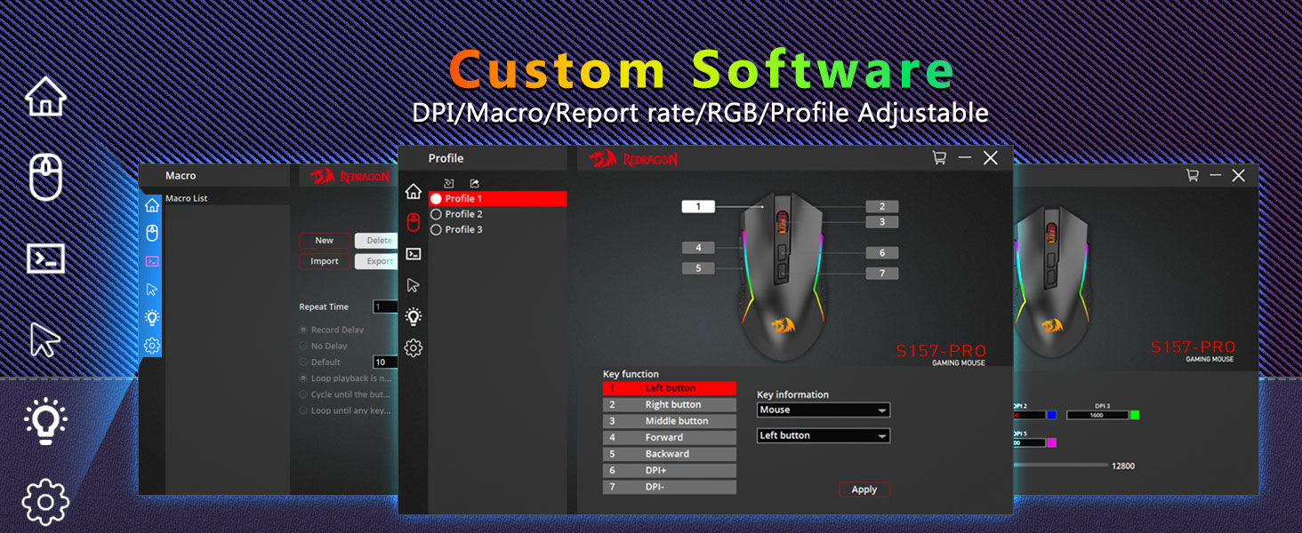 Max 12800 DPI Justerbar- Utrustad med 5 inbyggda DPI-nivåer som gör att dina musrörelser kan registreras till varje exakt plats. 5 DPI-nivåer är gratis att göra-det-själv med programvara, gör det möjligt för spelare att byta snabbt i spelet.