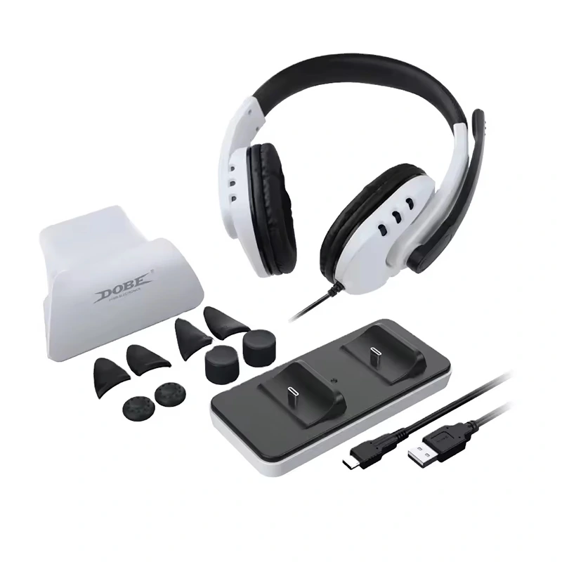 Skräddarsydd grossist DOBE PS5 spelkontroll 12 i 1 set, sätesladdare + trådbundna hörlurar + stativ + avtryckarknapp + joystick lock set