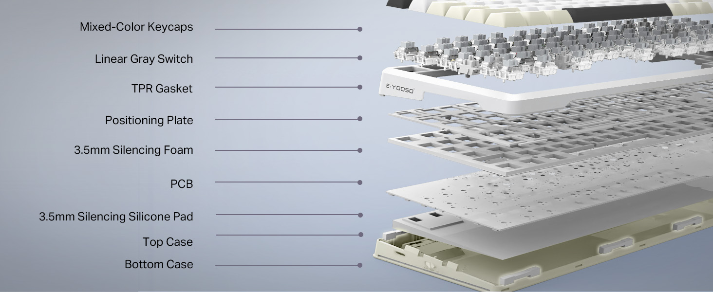Silikonpackningar eller poronskum med hög densitet med olika hårdhetsnivåer ger tydligt olika taktila återkopplingar. Mjukare material ger märkbar deformation dämpning, vilket gör dem idealiska för användare som söker en mildare typupplevelse. Akustiskt undertrycker denna struktur i sig fallet Echo, och när den är i par med IXPE -switchdyna och Poron Plate -skum kan den eliminera över 90% av resonansbruset, vilket gör att switcharnas ursprungliga ljudegenskaper kan lysa igenom.