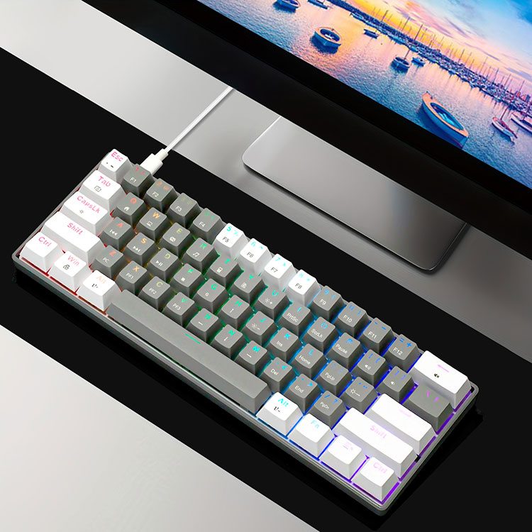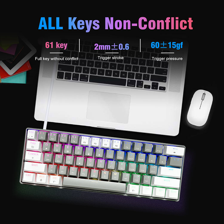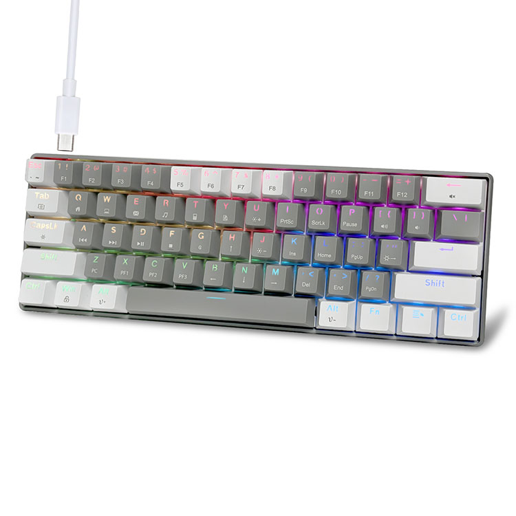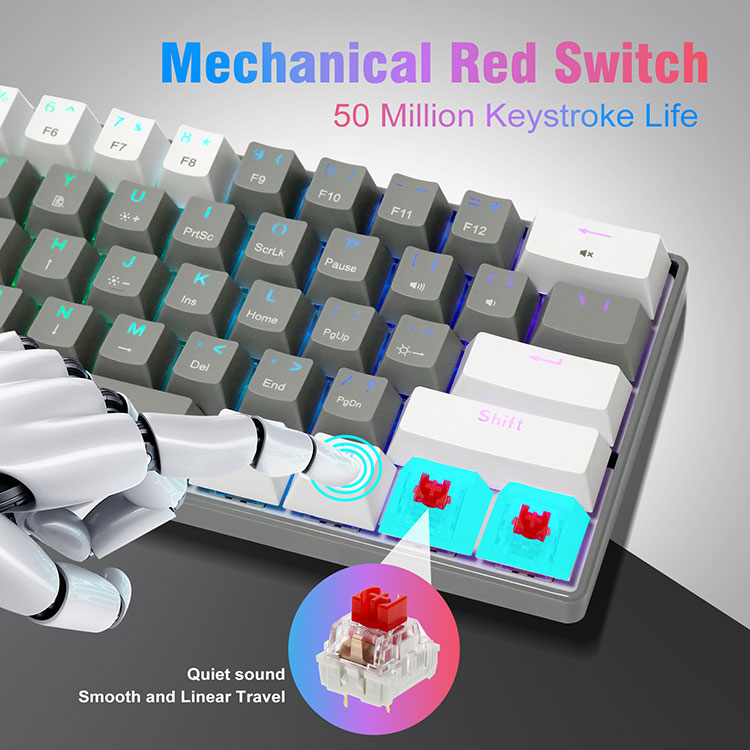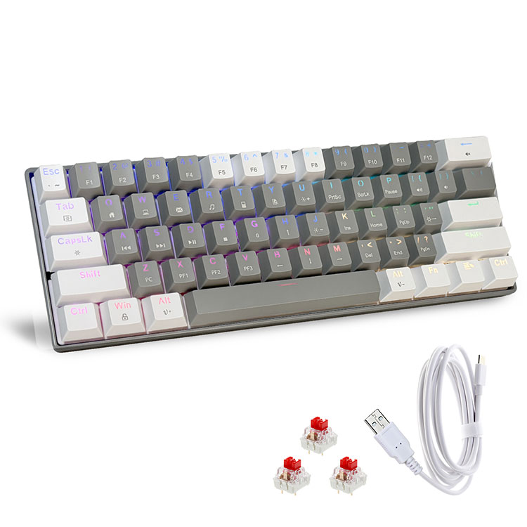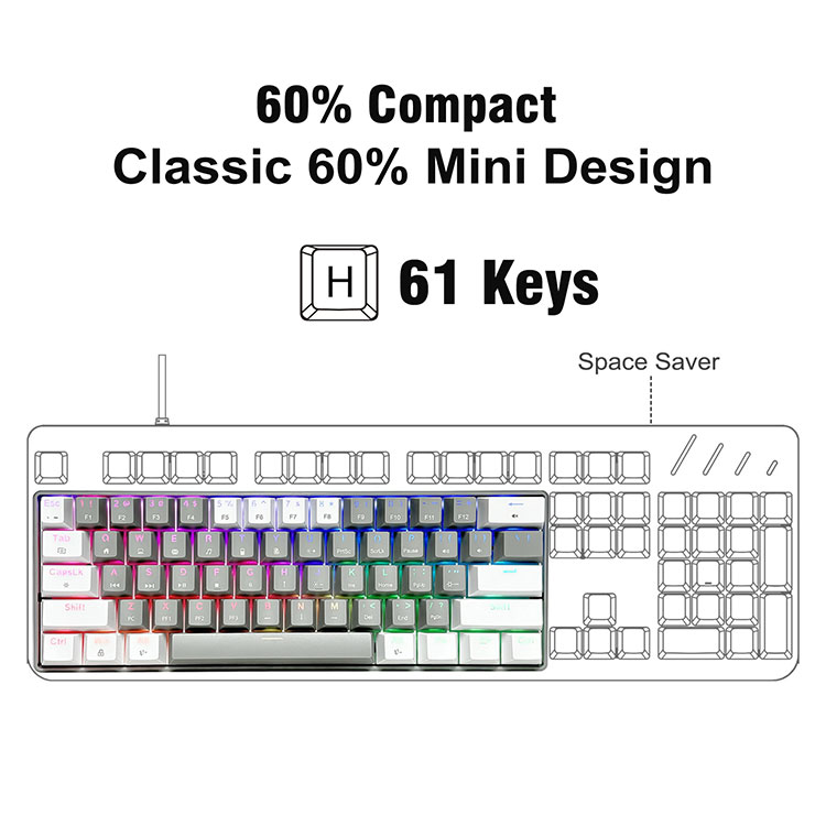 · 60 procent bärbar tangentbordsdesignDetta bärbara 60% RGB mekaniska speltangentbord har en perfekt storlek och det är bra för alla miljöer, affärsresespel kontor hemmabruk, utan Numpad, mer praktiskt för spelare och maskinskrivare, ge mer utrymme till ditt skrivbord.