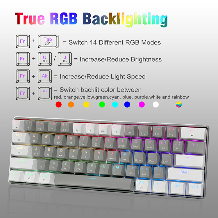 · Cool RGB-bakgrundsbelysningeffekt Tangentbordet med 60 % RGB inkluderar 14 bakgrundsbelysningseffekter och 8 fast bakgrundsbelysningsfärgväxling. Olika RGB-inställningar berikar din skrivtid. Belysningens hastighet och nivå kan också justeras efter dina behov. Double shot Injection Keycaps, karaktär bleknar aldrig.