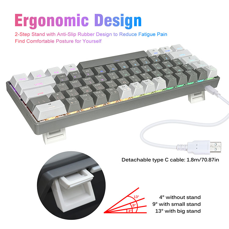 · Fullständig Anti-ghosting & ErgonomicAlla 61 nycklar är inga konflikter, vit grå mash up-design, ergonomisk fjädring med dubbelfärgad injektionsknappsats, dubbla stativfötter justerbar skrivvinkel och löstagbar usb-kabel, både praktiskt och vackert.