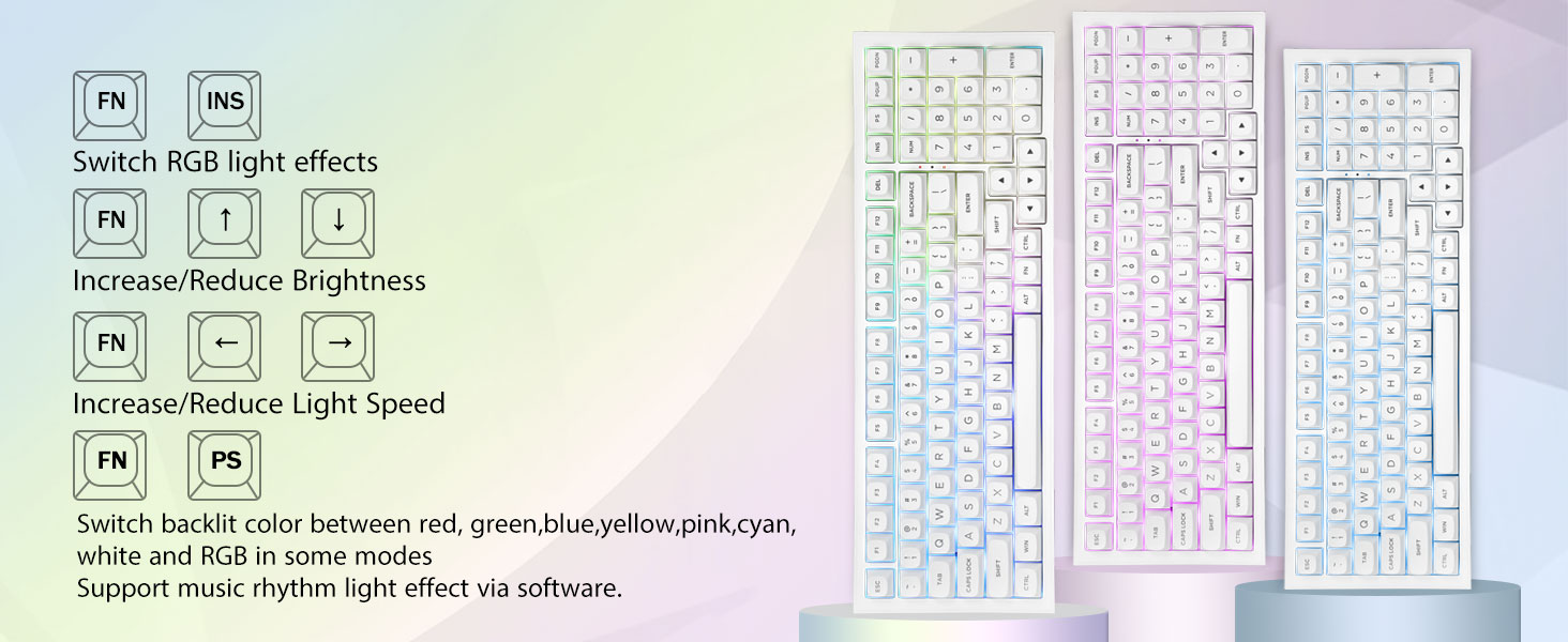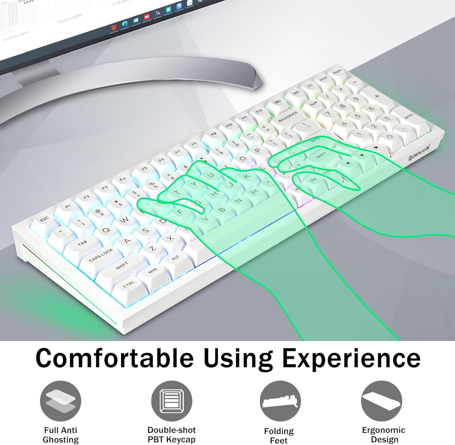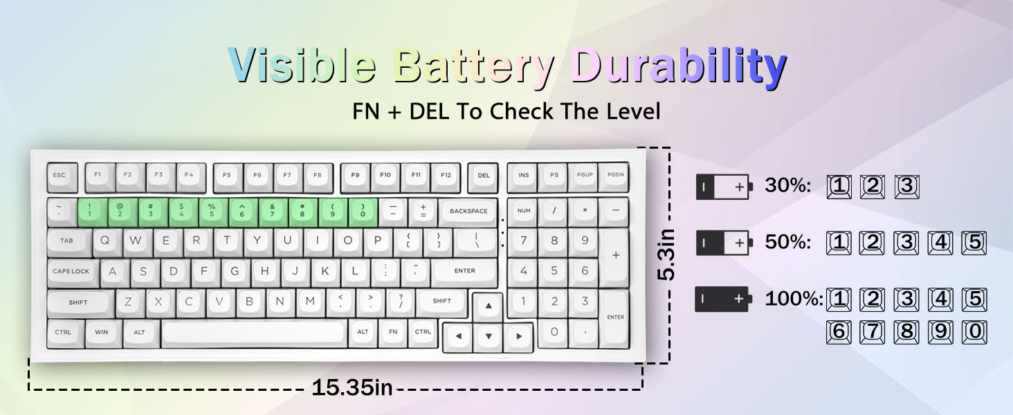 PBT Keycaps och 4000mAh batteri:99 tangenter 96% layout kompakt tangentbord kan spara mer skrivbordsutrymme samtidigt som du behåller nödvändiga piltangenter och nummerområde för spel och arbete. Det uppladdningsbara tangentbordet inbyggt 4000mAh batteri med stor kapacitet för att ge mer kraft och längre batteritid. Dubbla PBT-tangentkapslar, gjorda av tvåfärgsmaterial gjutna i varandra, gör att keycaps-karaktärerna bibehåller livfullheten och mättnaden, klara och inte blekna.