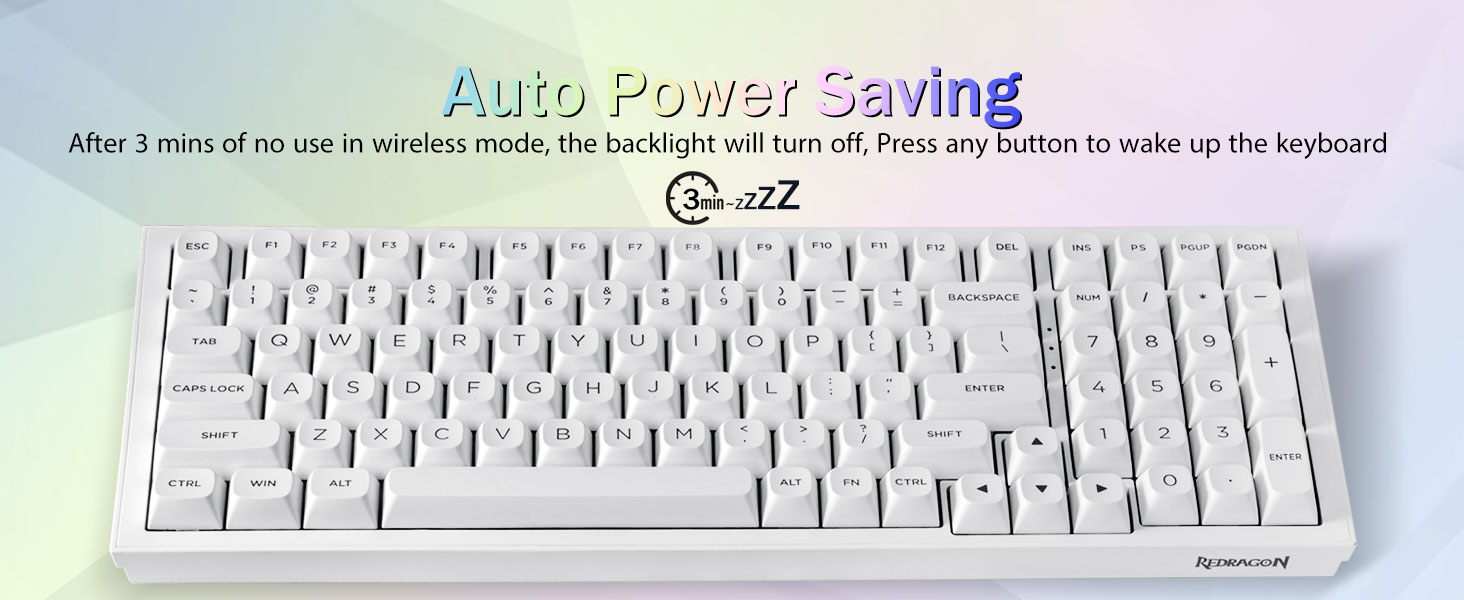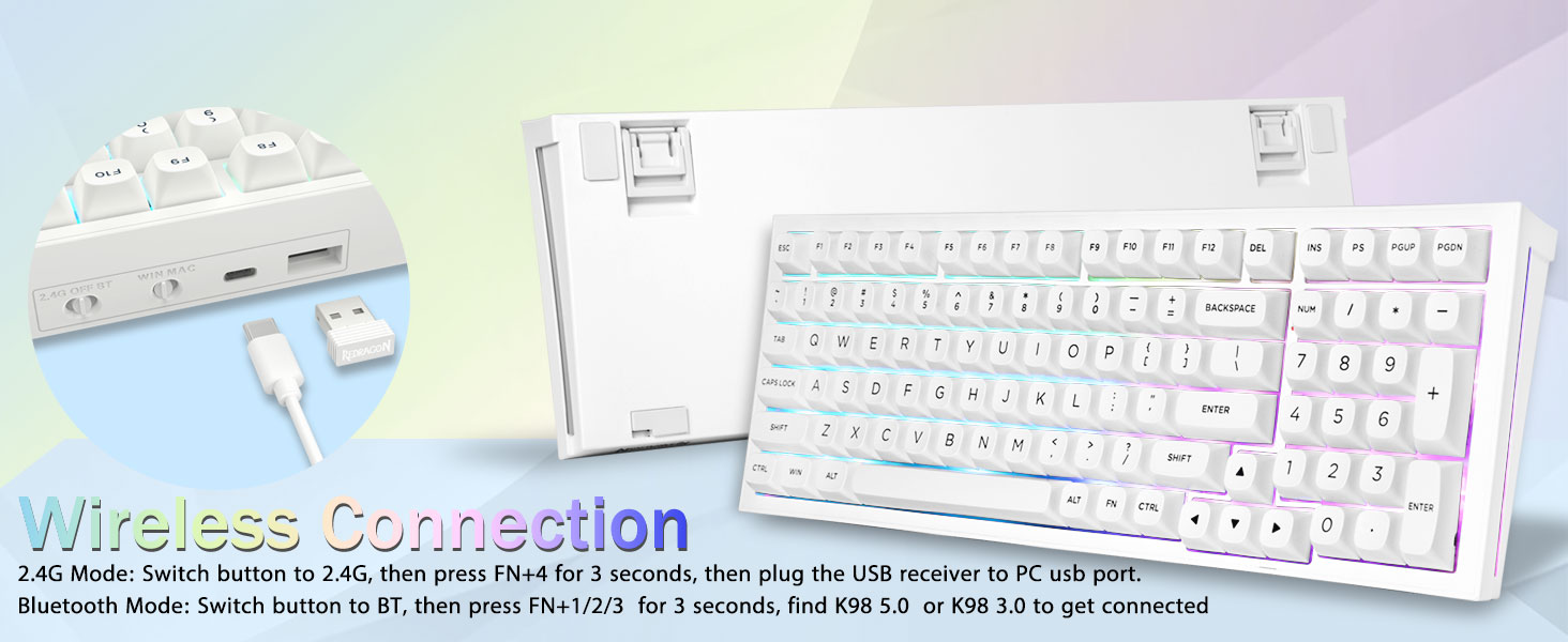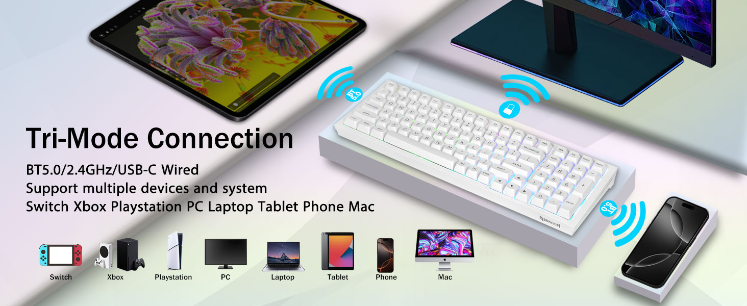 Multi-enhetsanslutning:Redragon K723 trådlöst mekaniskt tangentbord har tre anslutningsmetoder, inklusive BT5.0, 2,4 GHz trådlöst läge och USB-kabelläge. Den kan anslutas till upp till fem enheter samtidigt, och växla mellan dem enkelt med FN och tangentkombinationer. Inga gränser för din tangentbordsanslutning för att möta behoven av arbete, spel och studier.