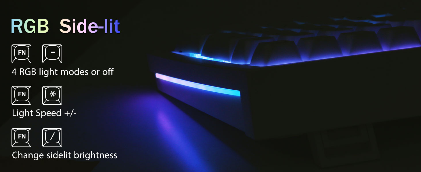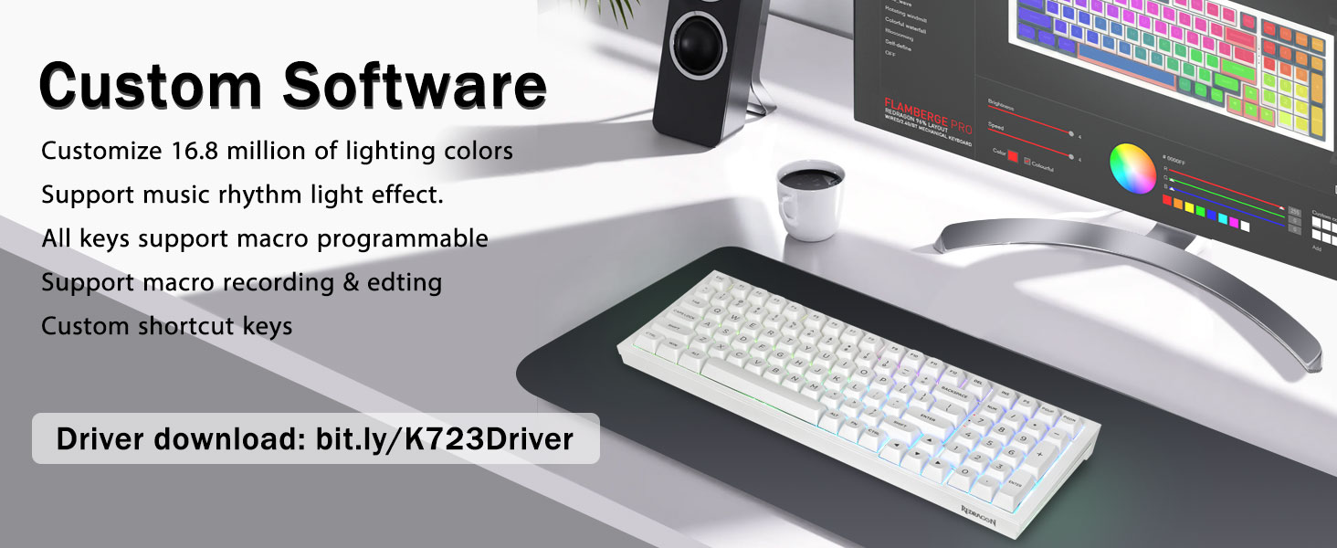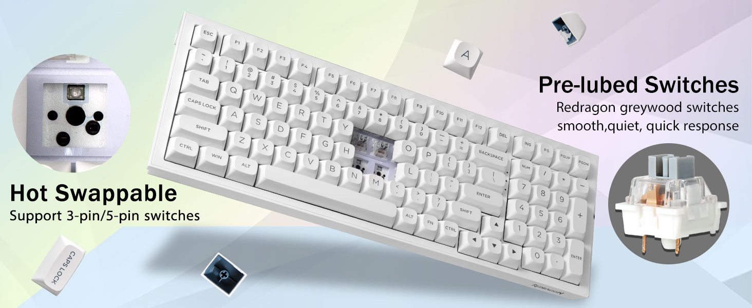 Hot-swap anpassat tangentbord:Omkopplarna och knapparna kan bytas ut fritt (tangentkapslar/brytare ingår i paketet). Detta anpassningsbara tangentbord med hot-swap PCB tillåter användare att enkelt byta ut 3 stift/5 stifts brytare utan problem med lödning. K723 mekaniska tangentbord utrustade med försmorda linjära omkopplare, ger smidig skrivkänsla och behagligt skrivljud, ger snabb respons för spännande spel