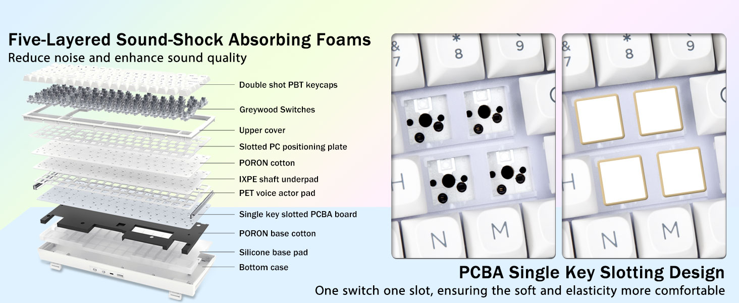 Packningsstruktur och kretskort med enkel nyckel:Detta datortangentbord har en packningsstruktur, utökad integrerad silikonkudde och PCB-kortslitsning med enkel nyckel, optimerar bättre spänst och stabilitet, vilket gör att handen känns mjukare och mer elastisk. Fem lager fyllnadsljuddämpare fyller gapet mellan kretskortet, positioneringsplattan och axeln, och motverkar effektivt kavitetsljudet från axeln som träffar positioneringsplattan och ger en solid känsla.