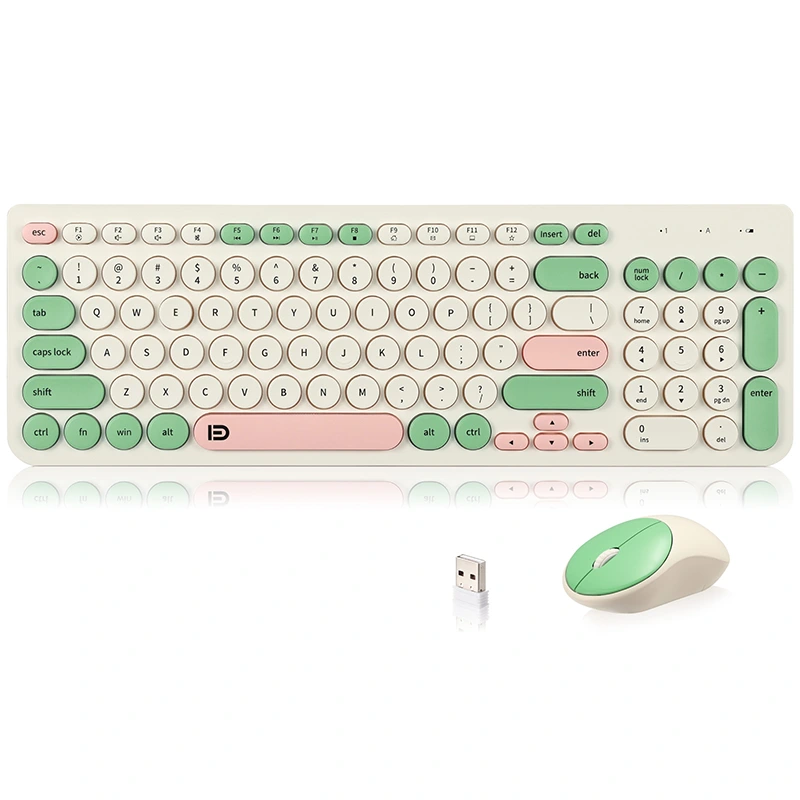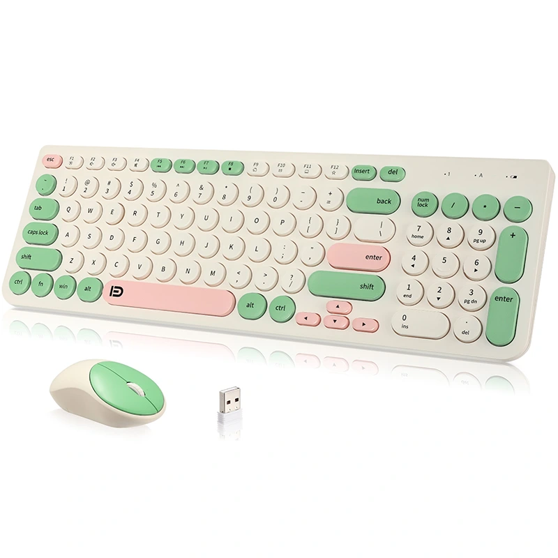 Trådlöst tangentbord och mus 2,4 GHz Combo, Retro skrivmaskin med runda knappsatser, 104 tangenter Full-Size USB Tyst Söt Mus för stationär dator, bärbar dator och dator